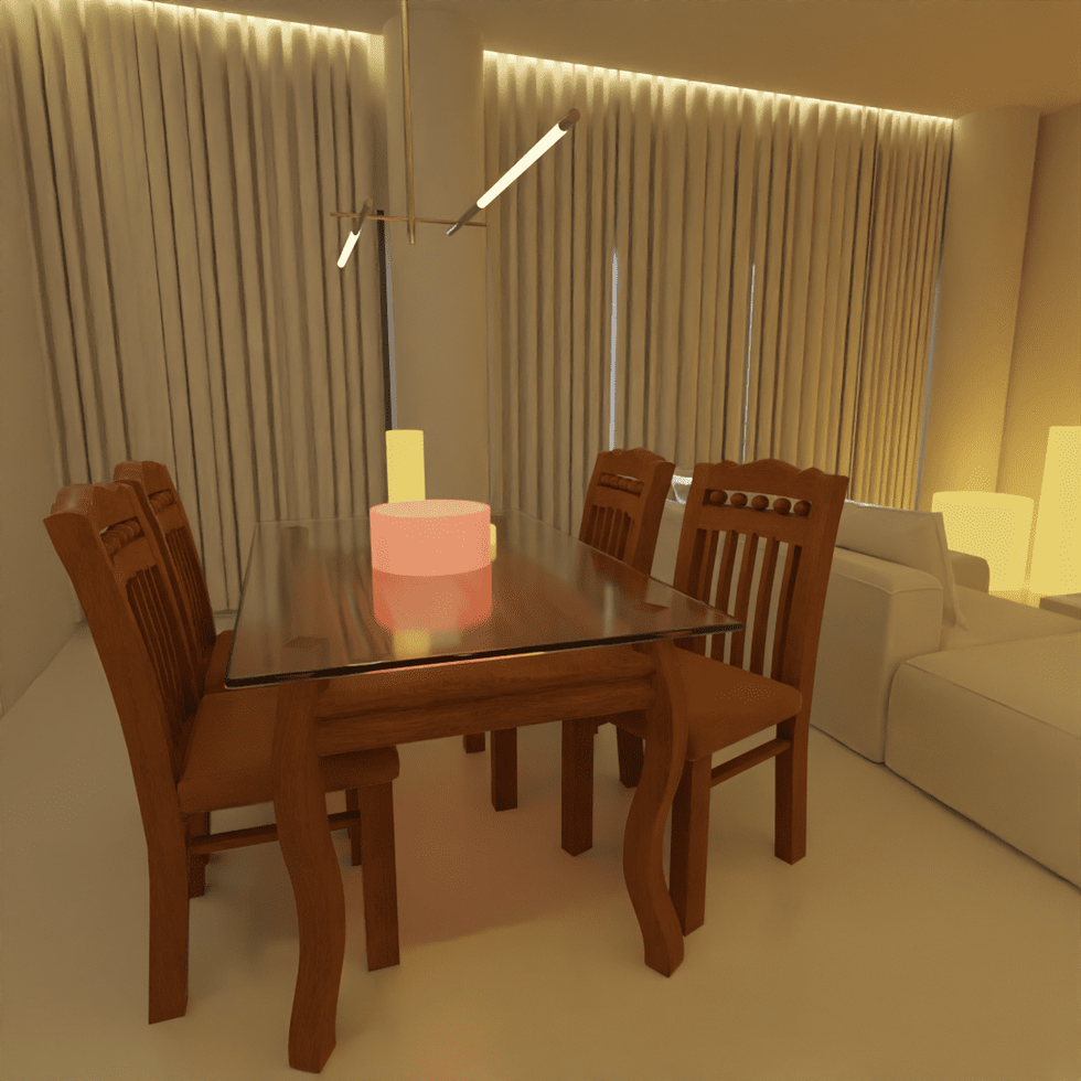 This 3D rendered image, created in Blender, showcases a modern kitchen interior with a sleek design and a dining area. The scenes features a dining table and chairs in the foreground, well-lit with neutral tones and clean lines, highlighting the contemporary aesthetic of both the interiors.